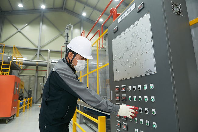 에코크레이션의 열분해 기술이 적용된 뉴에코원 공장 엔지니어가 열분해유 생산 설비를 시험 가동하고 있다.
