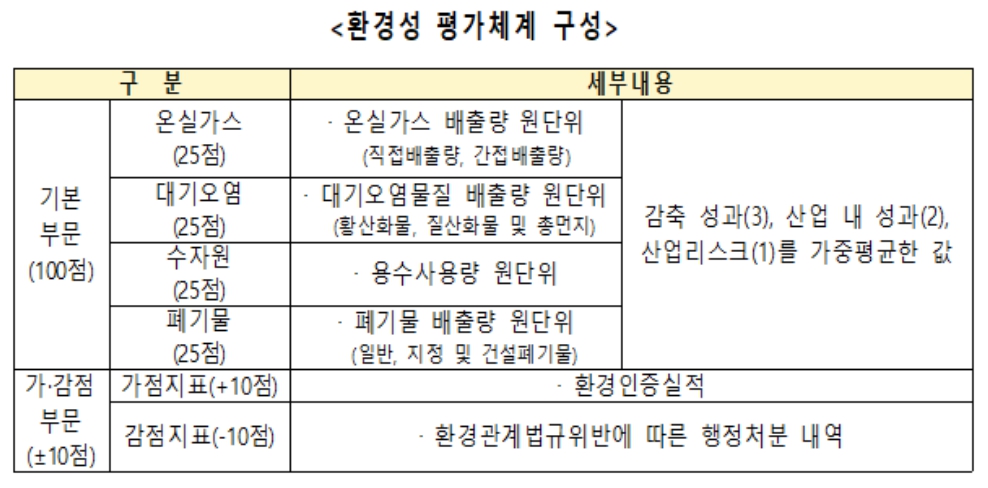 이와 함께 환경부는 수집·관리 중인 환경정보 데이터베이스를 활용해 정량 지표 중심의 평가지표를 제시하는 등 정보의 신뢰성과 객관성이 높은 평가체계를 구축했다. 또한, 환경적으로 유사한 기업 간의 비교가 이뤄지도록 환경성 평가에 적합한 25개 산업분류기준을 새로 마련했다.