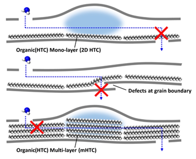연구팀은 그래핀을 대면적으로 합성하는 과정에서 발생하는 나노구멍으로 가스차단 효과가 떨어지는 문제를 해결하기 위해 긴 체인구조를 가지는 유기물질들이 그래핀 표면위에서 스스로 정렬하여 유기박막을 형성하는 자기조립 현상을 이용하였다. 유기박막이 가스분자가 유입되는 이동통로인 그래핀의 나노구멍을 막아줌으로써 수분투과율을 기존 그래핀 가스차단막의 1/700 수준으로 낮추었다. 또한 유기박막의 두께를 나노미터 수준으로 제어함으로써 차세대 디스플레이 가스 차단막에 필요한 물성인 투명성과 유연성을 그래핀에서 유지할 수 있었다.