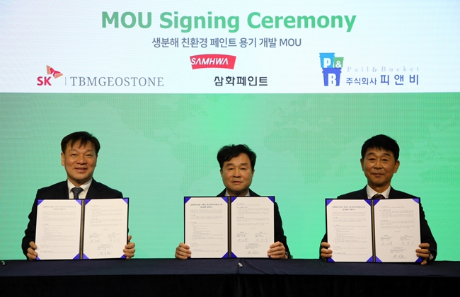 SK티비엠지오스톤과 삼화페인트공업, 용기 제조 전문회사 피앤비는 지난 1월 22일(월) 서울 종로구 SKC 본사에서 이 같은 내용을 담은 ‘생분해 친환경 페인트 용기 개발 업무협약’을 체결했다.
