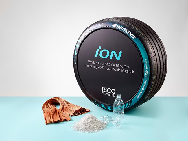 한국타이어는 SK케미칼, 효성첨단소재와 2년여에 걸친 연구개발 협력으로 화학적 재활용 PET 섬유 타이어코드를 비롯해 바이오·서큘러·바이오-서큘러 폴리머, 바이오 기반 실리카 등 지속가능 원료가 45% 포함된 프리미엄 전기차 전용 타이어 '아이온' 개발에 성공했다.