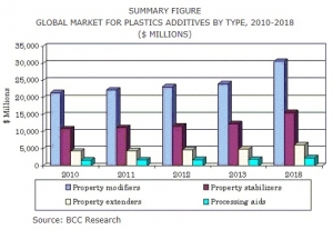 BCC Research는 이 보고서에서 2011년 세계 플라스틱 첨가제 시장 규모가 396억 달러에 이른 것으로 추산했으며, 2012년에는 413억 달러 규모로 성장할 것이라고 내다봤다. 또 2013-2018년 4.9%의 연평균 복합 성장률(CAGR)로 확대되어 2018년에는 약 547억 달러 규모에 달할 것으로 예측하고 있다. 2011년 171억 달러를 기록한 아시아의 플라스틱 첨가제 시장은 연평균 복합 성장률 5.4%로 확대되어 2013년에는 186억 달러, 2018년에는 242억 달러에 달할 전망된다.