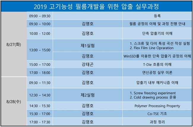 1일 차인 8월 27일(화)에는 ‘필름 공정의 이해 및 과정 진행 안내’를 시작으로, 제1실험과 제4강의 강의로 진행된다. 2일 차인 28일(수)에는 ‘압출기 내부 메커니즘 이해’ 강의를 시작으로 제2실험과 총 3강의 강의가 진행될 예정이다.