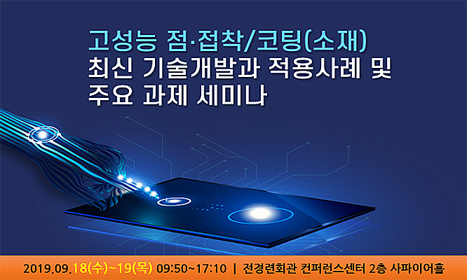 9월 19일(금) 세미나에서는 ▲핫멜트 접착제 최신 기술개발과 적용사례 및 주요 과제 ▲고성능 마이크로 LED용 점ㆍ접착제 최신 기술개발과 적용사례 및 주요 과제 ▲고성능 전자소자 패키징용 점ㆍ접착제 최신 기술개발과 적용사례 및 주요 과제 ▲실란 화합물을 이용한 코팅(소재) 최신 기술개발과 적용사례 및 주요 과제 ▲전도성 고분자를 이용한 코팅(소재) 최신 기술개발과 적용사례 및 주요 과제 ▲고밀도 세라믹 코팅(소재)/분사 공정 최신 기술개발과 적용사례 및 주요 과제 ▲자동차용 유리 대체 Polycarbonate(PC)글레이징 코팅(소재) 최신 기술개발과 적용사례 및 주요 과제 등의 주제가 연이어 발표된다.