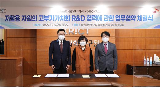 한국화학연구원이 SK건설과 지난 11월 12일(목) 화학연 행정동 중회의실에서 폐플라스틱·쓰레기 매립지 가스 등 활용도가 낮은 자원의 부가가치를 높이기 위한 업무협약(MOU)을 체결했다.