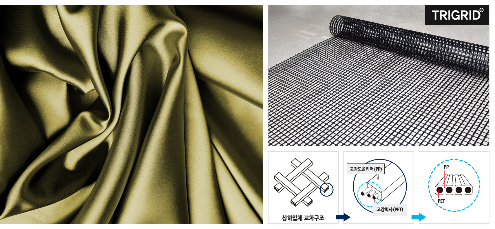 지오그리드는 토목공사에서 지반을 보강하여 보강사면이나 보강토 옹벽 구조물의 안정성을 확보하고, 연약지반의 침하를 막는 역할을 하는 소재이다. 휴비스 지오그리드 브랜드인 '트리그리드'는 서로 맞물린 상하입체 교차 구조로 시공성, 안정성, 경제성이 우수하여 다양한 건설 현장에 사용되고 있으며 세계 특허 및 EU 수출에 필요한 CE Mark, 일본 토목연구센터 인증 등을 획득하였다. 2007년 국내 판매를 시작으로 일본과 유럽 등 해외 시장 확대에 주력하고 있다.