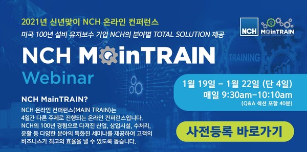 NCH의 온라인 기술 컨퍼런스는 오는 1월 19일(화)부터 22일(금)까지 4일간, 매일 오전 9시 30분부터 10시 10분까지 총 40분간 진행된다. 이번 컨퍼런스에서는 NCH의 100년 사업 경험으로 다져진 산업, 상업시설, 수처리, 윤활 등 다양한 분야의 특화된 주제들을 선정하여 고객 설비가 최고의 효율을 낼 수 있도록 돕는 기술 정보와 신기술을 소개된다.