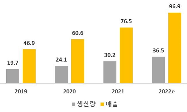 중국의 생분해 플라스틱 총 생산량 및 매출수익은 각각 16.6만 톤, 33.9억 위안이었으나, 2020년에는 24.1만 톤, 60.6억 위안으로 크게 증가했다. 생산량과 매출이익의 연평균증가율은 각각 9.7%, 15.7%로 고속성장했고, 택배박스(13.4%), 일회용 식기(15.8%), 일회용 쇼핑백(16.0%) 등의 매출이익도 모두 두 자릿수 연평균성장률을 기록한 것으로 나타났다. 중상산업연구원은 정부방침 및 시장수요 증가에 따라 생산량 및 매출이익은 고속성장을 이어가며 2022년에는 36.5만 톤, 96.9억 위안에 다다를 것으로 전망했다.
