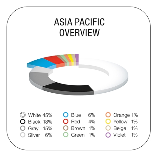 전 세계 다른 지역들처럼 아태지역에서도 화이트는 가장 인기 있는 색상이었지만, 올해 주목할 만한 점은 그레이 색상 점유율의 증가이다. 이는 자동차 구매자의 변화하는 가치와 습관을 보여주며, 자동차 산업에 새로운 시대가 열린 것을 암시한다.