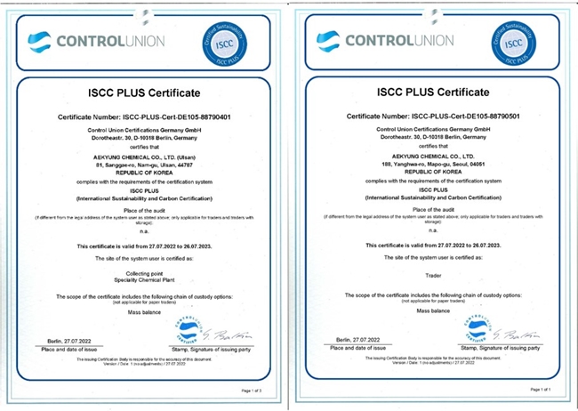 애경케미칼이 친환경 가소제 개발로 획득한 ISCC PLUS 인증 / 사진. 애경케미칼