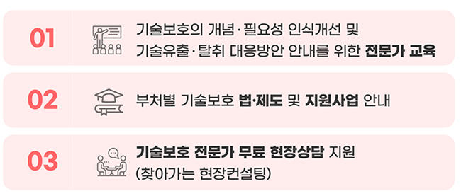 또한, 설명회에 참가하는 기업은 현장 경험이 풍부한 전문가에게 ‘중소기업 기술보호를 위한 핵심수칙 안내(가이드)’와 ‘기술유출·탈취 판례를 통한 대응 방안 및 중소기업기술보호법 개정 사항’ 등 다양한 강의를 수강할 수 있고, 기술보호 전문가의 현장 상담을 희망하는 기업은 개별기업 상황에 맞는 맞춤형 보안 안내(가이드)도 지원받을 수 있다.