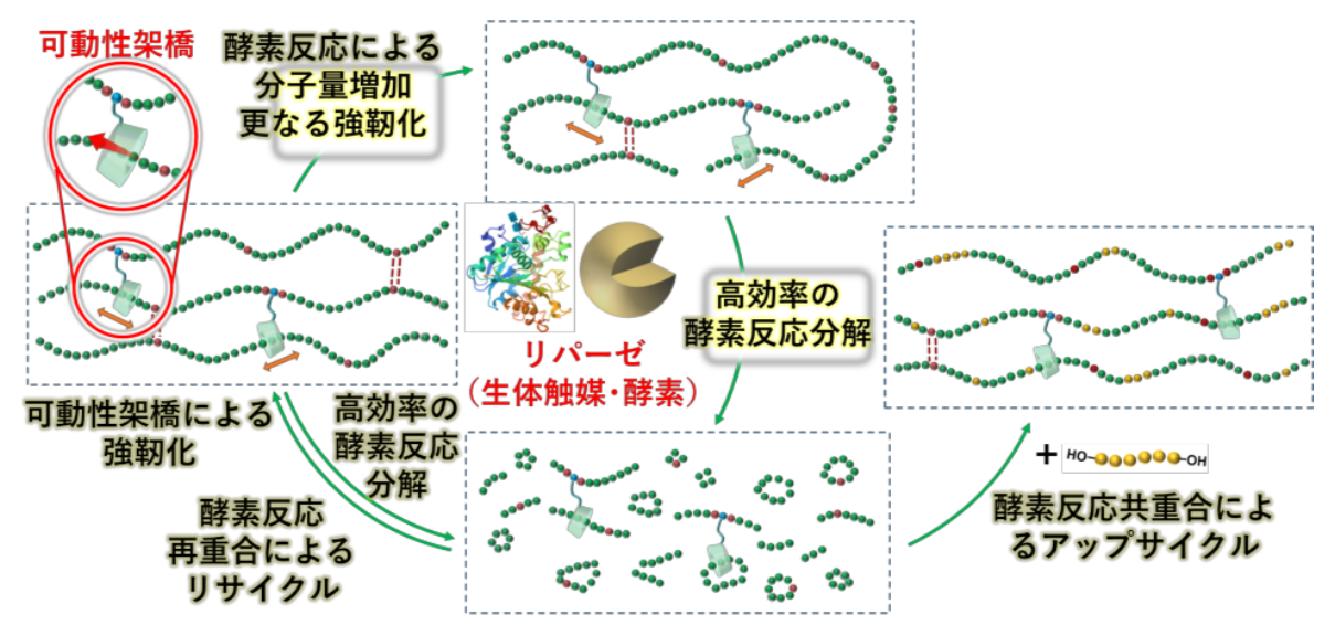 이번에 연구팀은 ‘끈이 루프를 통과하는 구조’의 가동성 가교를 생분해성 폴리머에 도입하는 데 성공해, 3R(강인성에 의한 Reuduce, 재성형성에 의한 Reuse, 효소촉매분해 재중합에 의한 Recycle)과 더불어 분해물에 새로운 가치를 부여하는 업사이클을 실현했다. 이에 따라 폐고분자 소재를 폐기물이 아닌 재사용이 가능하고 부가가치를 창출할 수 있는 자원으로 재정의하는 것이 자원 재활용에 대한 새로운 관점과 가치를 제시할 예정이다.