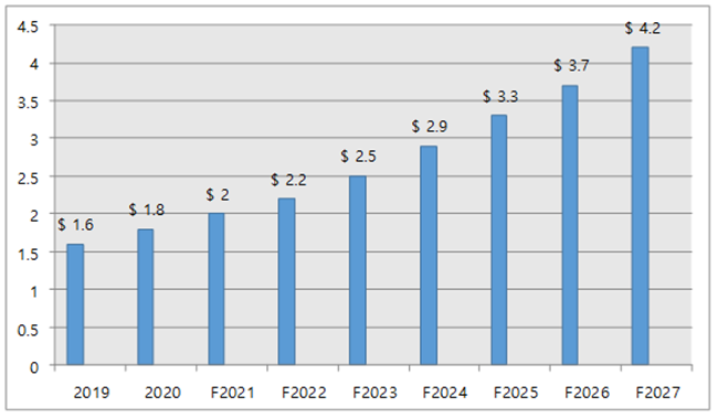 세계 바이오플라스틱 시장 성장추이 전망(단위 : US$ 10억)