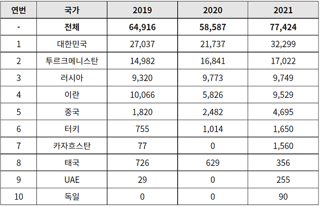 우즈베키스탄의 폴리프로필렌 주요 수출국(단위 : 천 달러)