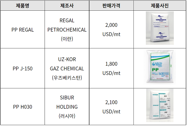 시중에서 판매중인 주요 폴리프로필렌 제품들(환율 $1 = 10,847 UZS)