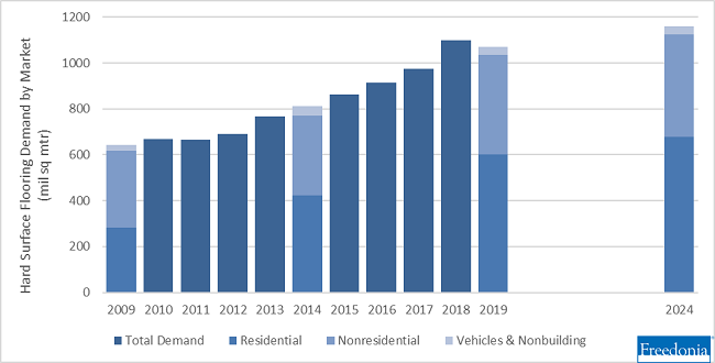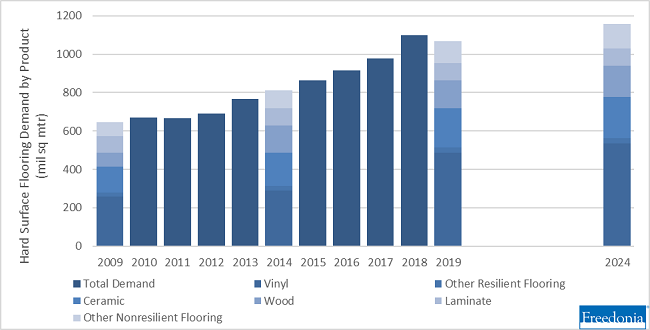 Freedonia는 경질 바닥재 시장을 크게 플라스틱(Vinyl), 세라믹(Ceramic), 목재(Wood), 합성목재 합판(Laminate) 및 기타 품목으로 분류하며, 그중에서 특히 플라스틱 바닥재 품목 분야가 비중이 가장 높다. 2019년 기준 플라스틱 바닥재의 수요는 전체 수요의 45%를 차지하는 약 4억 8,540만 달러를 기록했으며, 2024년까지 이는 약 5억 3,420만 달러 규모로의 성장이 예상된다.