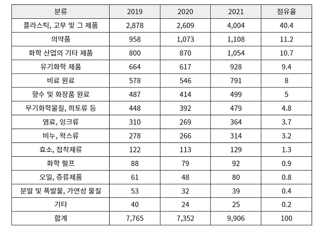 수입 화학제품 중에서는 플라스틱 및 고무 원료의 비중이 가장 높았으며, 2021년 기준 약 40%에 달했다. 2019년에는 전체 수입의 37%였으며, 2020년에는 35%의 비중을 보였다. 대표적인 플라스틱 및 고무 원료로는 폴리프로필렌, 고밀도 폴리에틸렌, 폴리염화비닐 등이 있다.