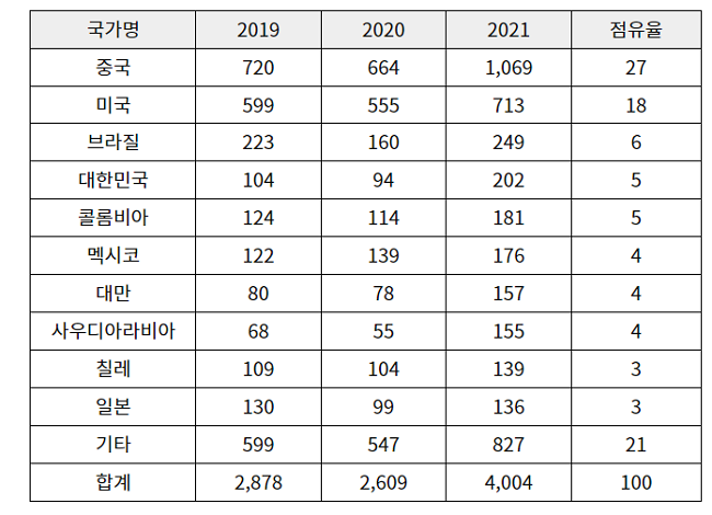 페루 화학 제품 연도별 수입액 및 점유율(단위 : US$ 백만, %)(사진. 페루 관세청)
