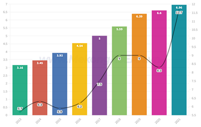 2013~2021년 베트남 플라스틱 수입 추이(단위 : 백만 톤, 십억 달러) / 사진. KOTRA 하노이무역관 종합