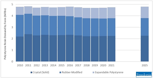 2010~2025년 미국 폴리스티렌 시장의 품목별 수요 변화 추이(단위 : 십억 파운드) / 자료. Freedonia