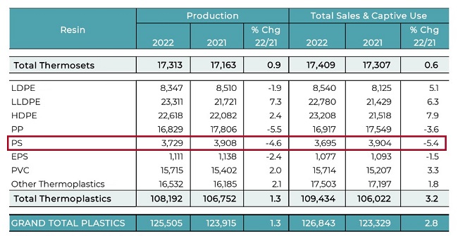 한편, 미국 화학협회(American Chemistry Council)는 미국 내 폴리스티렌을 비롯한 각종 플라스틱 수지의 2021년 대비 2022년 생산 및 판매량이 대부분 소폭 감소하거나 유사한 수준을 보인 것으로 분석한 바 있다. 그중 폴리스티렌의 경우 전체 플라스틱 수지 시장에서 큰 비중을 차지하는 품목은 아니나, 2022년 약 37억 파운드(약 185만 톤)가 생산된 것으로 집계됐다.