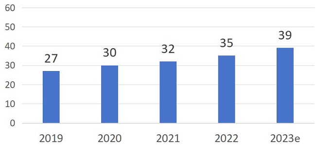 2021년, 2022년 중국의 EVA 수입 규모는 모두 전년 대비 증가했다. 중국의 태양전지 생산량이 증가하면서 2021년, 2022년 중국의 에틸렌-초산비닐 공중합체 수입금액은 각각 27억 달러, 33억 달러로 전년 대비 69%, 20% 늘어났다. 첸잔산업연구원에 따르면 중국의 태양전지 산업은 매년 30% 이상 성장하면서 2023년 중국의 EVA 수입금액도 30억 달러에 이를 것으로 예측했다.