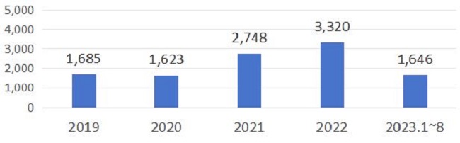 최근 5년(2019~2023년) 중국 EVA 수입금액 추이(단위 : 백만 불) / 사진. 한국무역협회, KOTRA 톈진무역관 정리