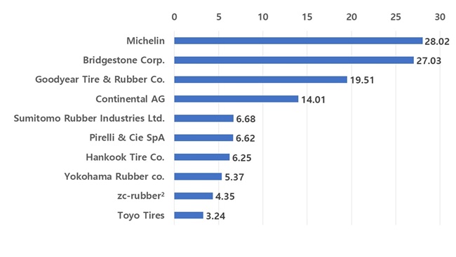 2022년 세계 타이어 제조사 매출 현황 / 자료. reifenpresse.de/Statista