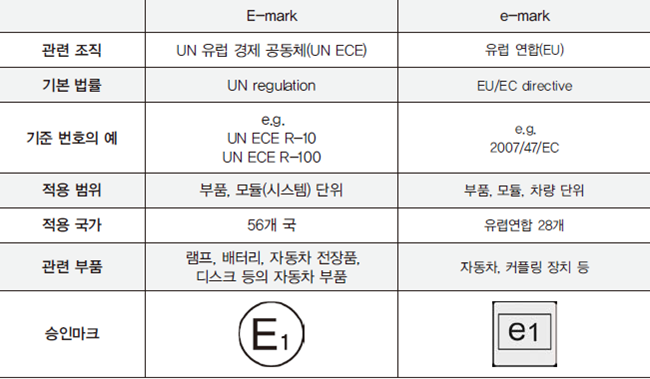 타이어 수출을 위해서는 EU 자동차 부품 형식 승인 e-Mark를 받아야 한다. e-Mark는 자동차 산업 분야에 관련된 EU 적합성 준수 마크로 유럽 시장에 자동차 및 관련 부품을 판매하기 전에 EU 회원국으로부터 반드시 형식 승인을 받아야 하는 강제 검사 제도이다.