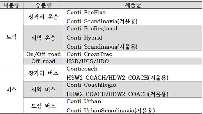 콘티넨탈의 트럭 및 버스 타이어는 운항 거리와 용도에 따라 ▲Conti EcoPlus ▲Conti EcoRegional ▲Conticoach ▲Conti CoachRegio와 같은 다양한 제품 라인으로 구성돼 있다. 최근에 개발된 conti regional, Conti EcoPlus와 같은 제품군은 친환경 타이어 제품들로 구름 저항을 줄이고, 트래드 마모성과 접지력을 크게 향상해 탄소 배출 및 연비 절감에 초점을 맞춘 타이어이다.