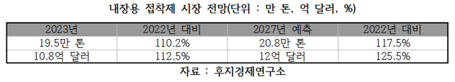 2022년 시장은 반도체 부족이 완화돼 자동차 생산이 회복을 향한 것으로 전년 대비 6.6% 증가한 17.7만 톤이 됐다. 문용 내장용 접착제가 가장 많아 시장의 29.4%를 차지했다. 이어 많이 사용된 것이 천장과 시트용으로, 모두 24.8%를 차지했다. 소재는 올레핀계 핫멜트 소재가 많이 사용돼 전체 시장의 31.8%를 차지한다. 2023년 글로벌 자동차 생산 회복에 힘입어 전년 대비 10.2% 증가한 19.5만 톤이 전망된다.