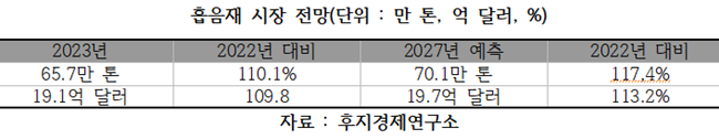 자동차 내외부품용 재료 시장은 지난 2022년 코로나19 등의 이유로 상당 부분 위축됐지만, 자동차 생산량 증가 등으로 인해 2023년에는 동 12.0%가 증가함 105.8억 달러를 경신했다. 이와 더불어 재생플라스틱과 흡음재 등 사용량이 증가해 시장 규모는 더 커질 것으로 전망된다.
